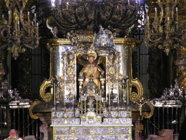 - en majesté, assis : c'est la figure auréolée du saint qui trône sur le maître autel de la cathédrale de Saint-Jacques-de-Compostelle ;